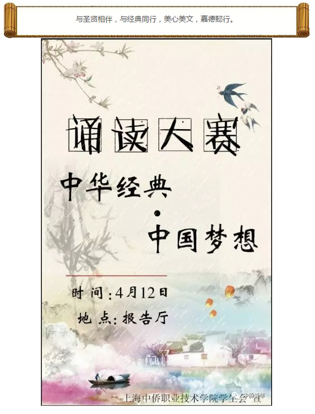 于4月12日晚6点于报告厅举办以“中华经典,中国梦想”为主题的经典诵读比赛。在诵读经典中潜移默化,培养仁义敦厚的性情,自信自强的人格,感恩图报的品质,勇于担当。
