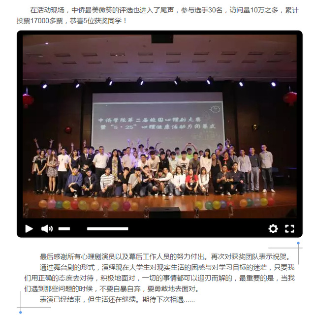 5月23日,我校2017年第二届校园情景剧大赛落下了帷幕。本次大赛围绕“健康校园,美丽心灵”这一主题就学生在环境适应,人际交往,学习活动,个人发展,等方面有了新的认识。