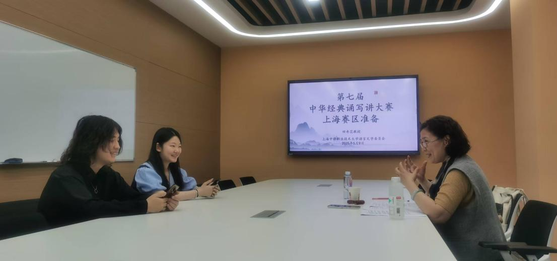 校语委近日特邀上海电视艺术家协会理事、全国口才等级测评中心考官、国家关心下一代工作委员会艺术体育高校委员会主任委员,“中华文化促进会社会艺术水平朗诵考级”标准示范朗读专家、上海市教育总工会诵读艺术“专家顾问”、上海市语言文字测试中心朗诵指导专家田奇蕊教授,为即将参加第七届中华经典诵写讲大赛的师生们进行赛前指导。